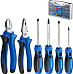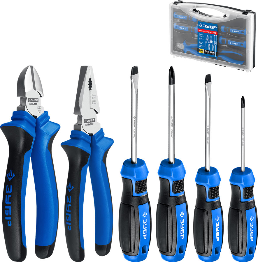 Небольшой набор самых востребованных в быту инструментов - плоскогубцы (180 мм), бокорезы (160 мм), 4 отвёртки. Эксцентриковый шарнир увеличенной мощности у губцевого инструмента. Особостойкое хромоникелевое покрытие для защиты от коррозии. Сталь Cr-Mo. Двухкомпонентные рукоятки обеспечивает надежный и комфортный хват. Пластиковый бокс.