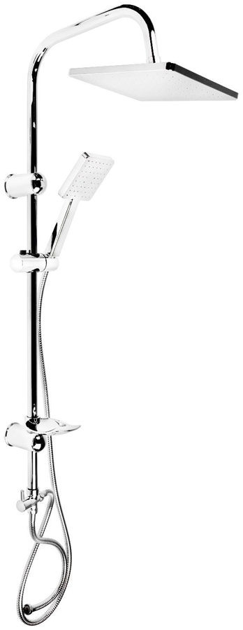 Металлический корпус с хромированной поверхностью. В комплекте: душевая стойка с тропическим душем и с держателем лейки и мыльницей, ручная лейка с шлангом. В комплекте: душевая система, шланг для подключения, крепёжные аксессуары.