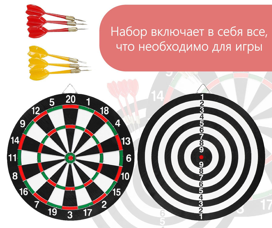 Увлекательная игра соберёт вокруг большую компанию. Устройте семейный чемпионат, пригласите друзей на турнир, и азартное настроение поможет каждому стать победителем. Игра в дартс развивает меткость, глазомер, реакцию, мелкую моторику и чувство соперничества. На обратной стороне мишень для дальних бросков. В комплекте 6 дротиков. Настенное крепление.