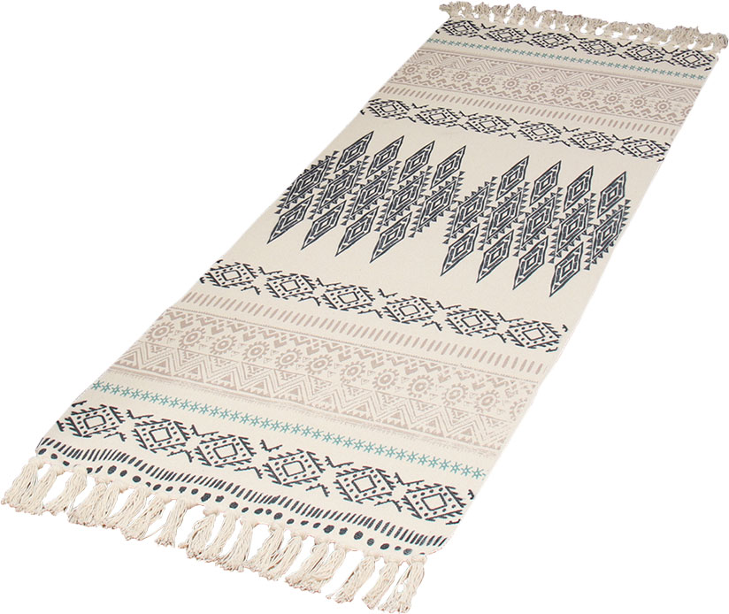 Плотный безворсовый коврик с интересным этническим узором и бахромой. Состав: 50% хлопок, 50% полиэстер.