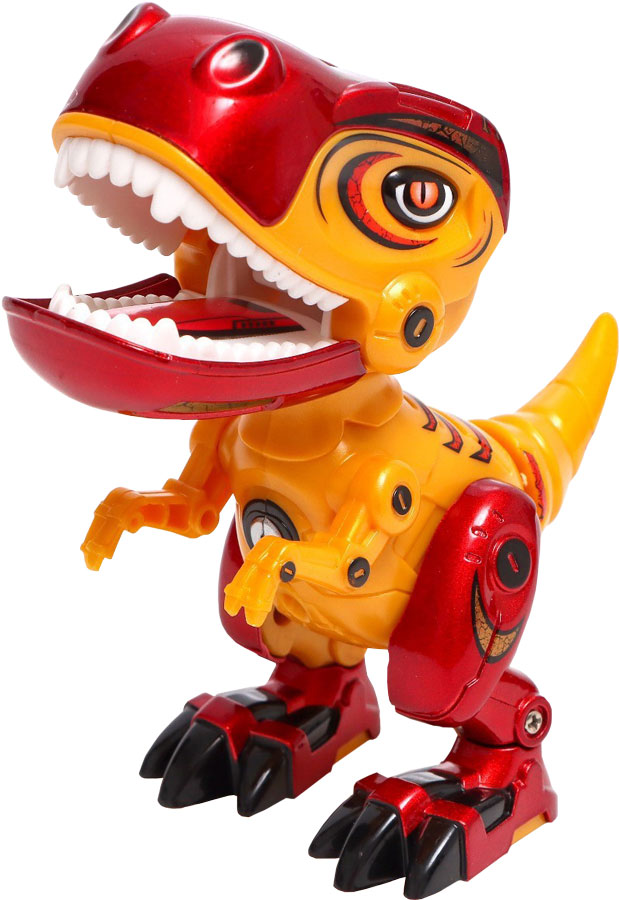 Интерактивный динозавр - реагирует на касания, звуковые и световые эффекты. Подвижные конечности, голова и хвост. Если нажать на нижнюю челюсть, то робот зарычит как настоящий динозавр! Размеры - 12х12х4,5 см. Работает от батареек.