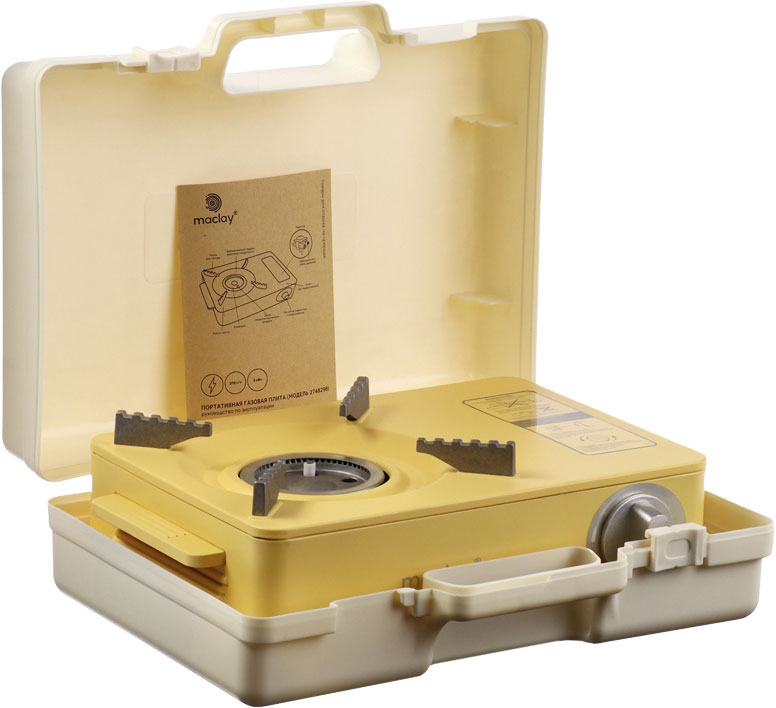 Кемпинговая газовая плитка с металлическим корпусом с отдельным отсеком для газового баллона. Фиксатор баллона с цанговым захватом. Пьезоподжиг позволяет разжечь огонь без зажигалки. Увеличенная мощность - 3 кВт. Температура горения: 700 °С. Регулировка пламени. Предохранитель для сброса давления. Максимальная нагрузка - до 5 кг. Размеры: 32,5х20х10,5 см. Удобный кейс для транспортировки. Вес в кейсе ~ 1,8 кг.