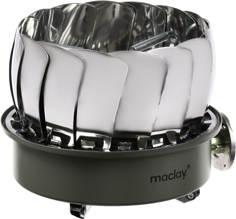 Портативная газовая плита со складными ножками и лепестковой ветрозащитой. Увеличенный диаметр - 26 см. Высота - 14 см. Работает от портативного газового баллончика (цанговое крепление). Пьезоподжиг позволяет разжечь огонь без зажигалки. Мощность - 2 кВт Температура горения: 500 °С. Регулировка пламени. Максимальная нагрузка - до 5 кг. Чехол из оксфорда. Вес ~ 700 гр.